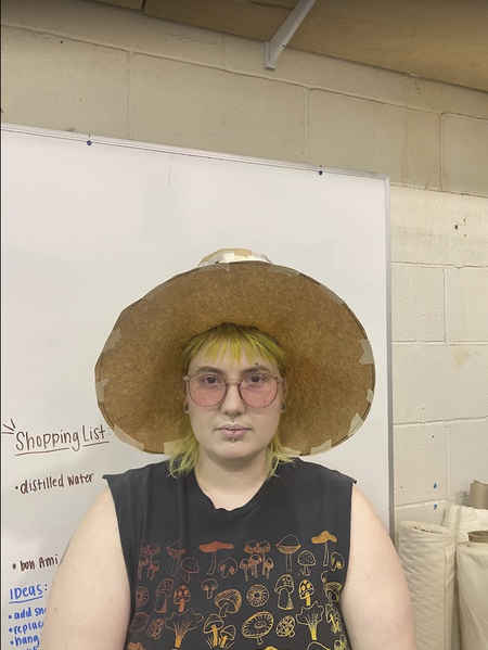 This bonnet is constructed from silk velvet as the outer fabric and ribbed taffeta to contrast, over a buckram base that I patterned and built to fit a 22" head. This hat features corded gathers along the outer brim, and a bias bound edge, along with contrasting ties along the edge. In the back, there is a soft cape over the back of the neck, with a contrasting cord. Constructed for Millinery class at Florida State University in April of 2023.